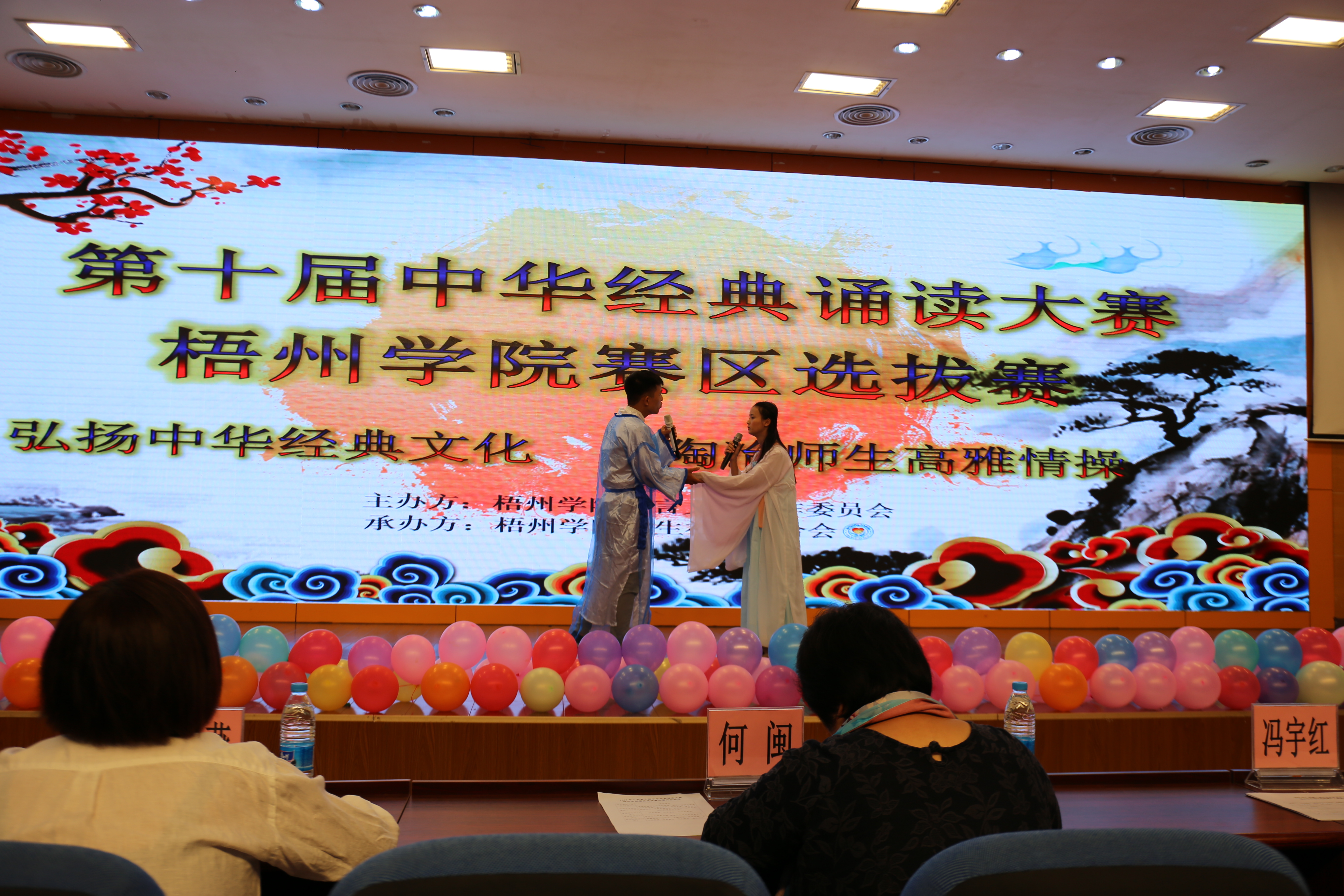 为深入贯彻习近平总书记关于传统文化教育的系列重要讲话精神,传承和弘扬中华优秀传统文化,10月31日晚,由梧州学院语言文字工作委员会主办、梧州学院学生社团联合会承办的以“弘扬中华经典文化,陶冶师生高雅情操”为主题的第十届中华经典诵读大赛梧州学院赛区选拨赛决赛于北校区学术报告厅顺利开展。梧州朗诵委员会主任、中国船舶工业集团总公司华南地区演讲指导老师何闽;梧州朗诵委员会专家顾问、梧州电台副台长、一级播音员冯宇红;汉语言文字学博士、文法学院副教授、国家级普通话水平测试员吴术燕;文法学院汉语言文学专业副教授秦延良出席并担任了本次大赛的评委。
