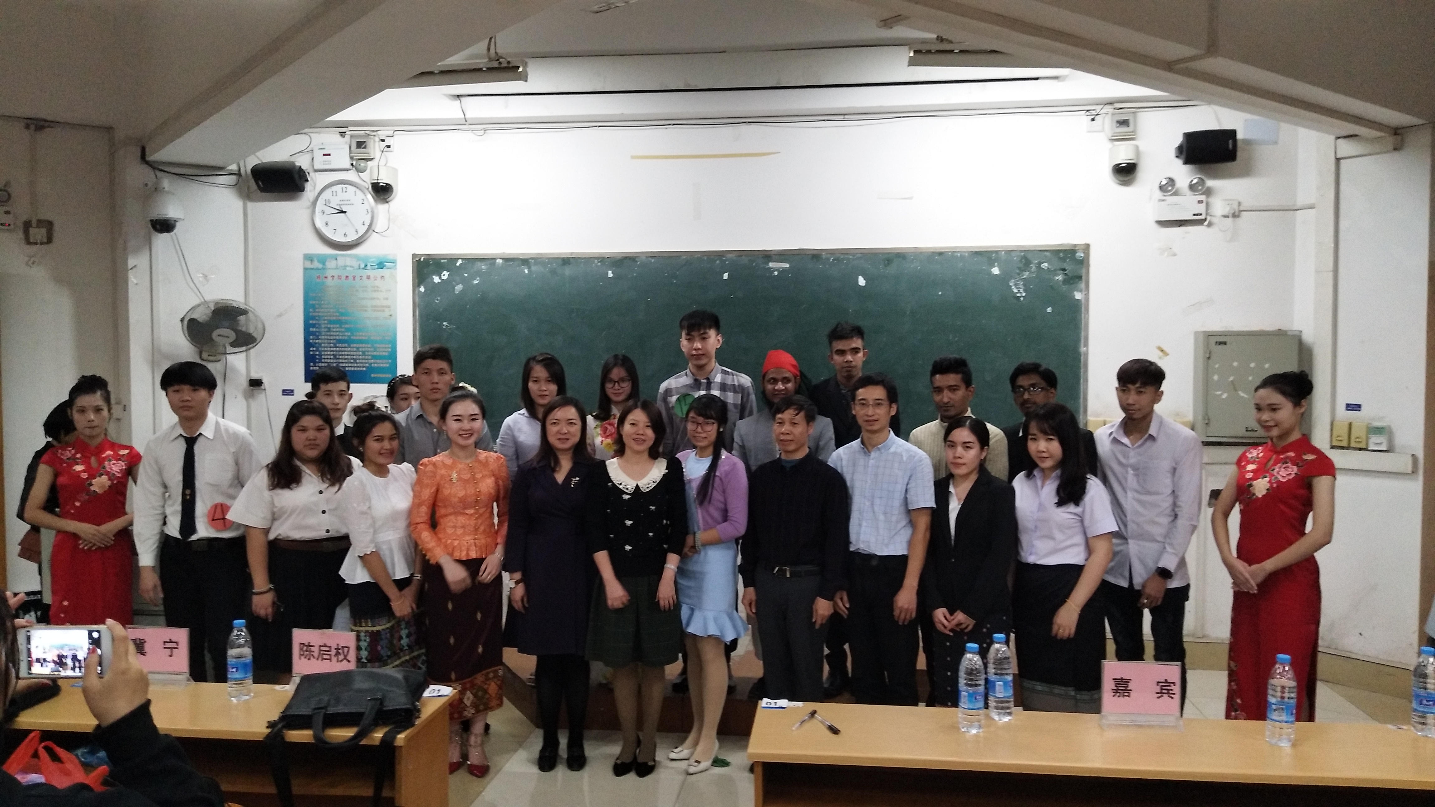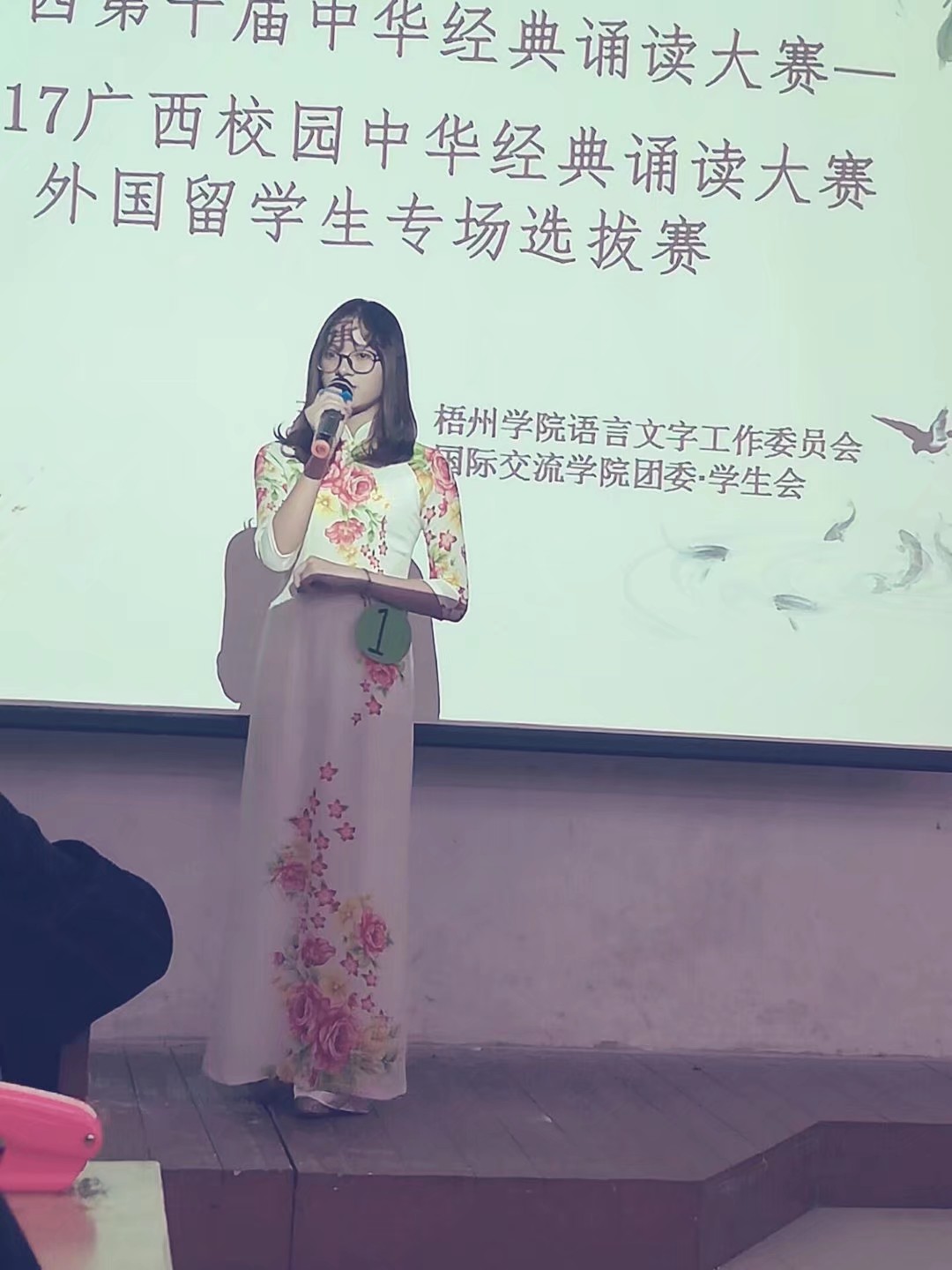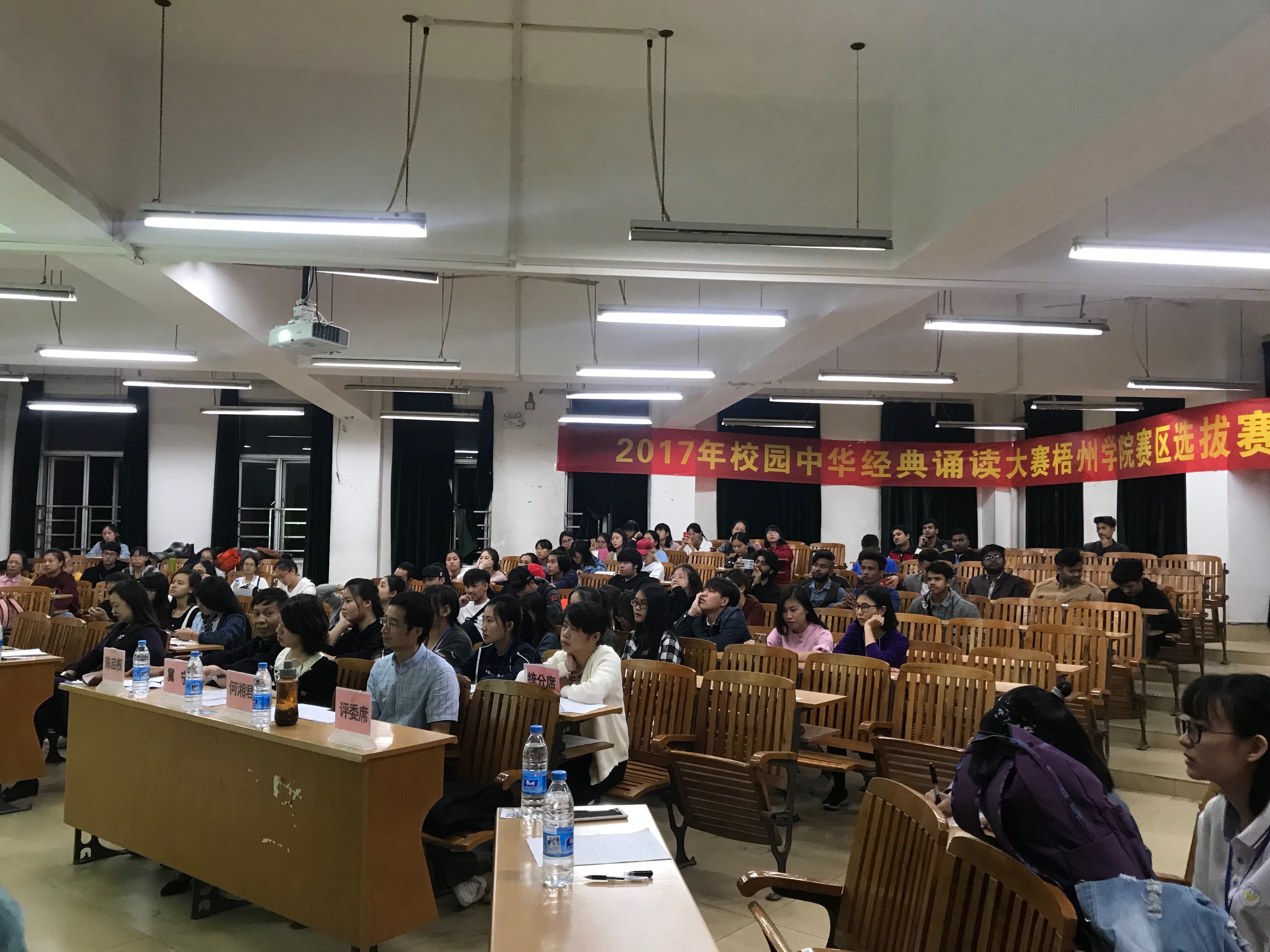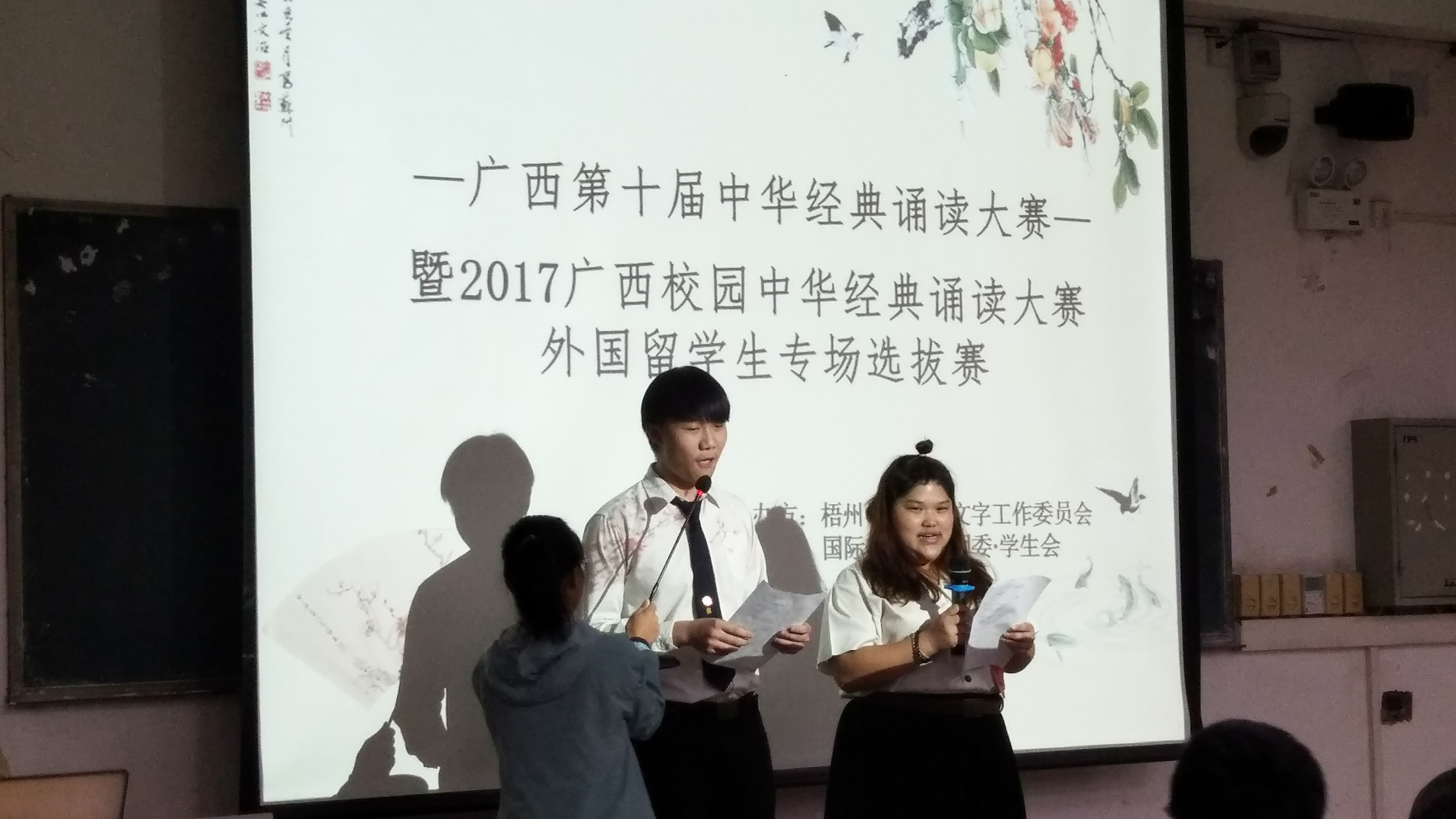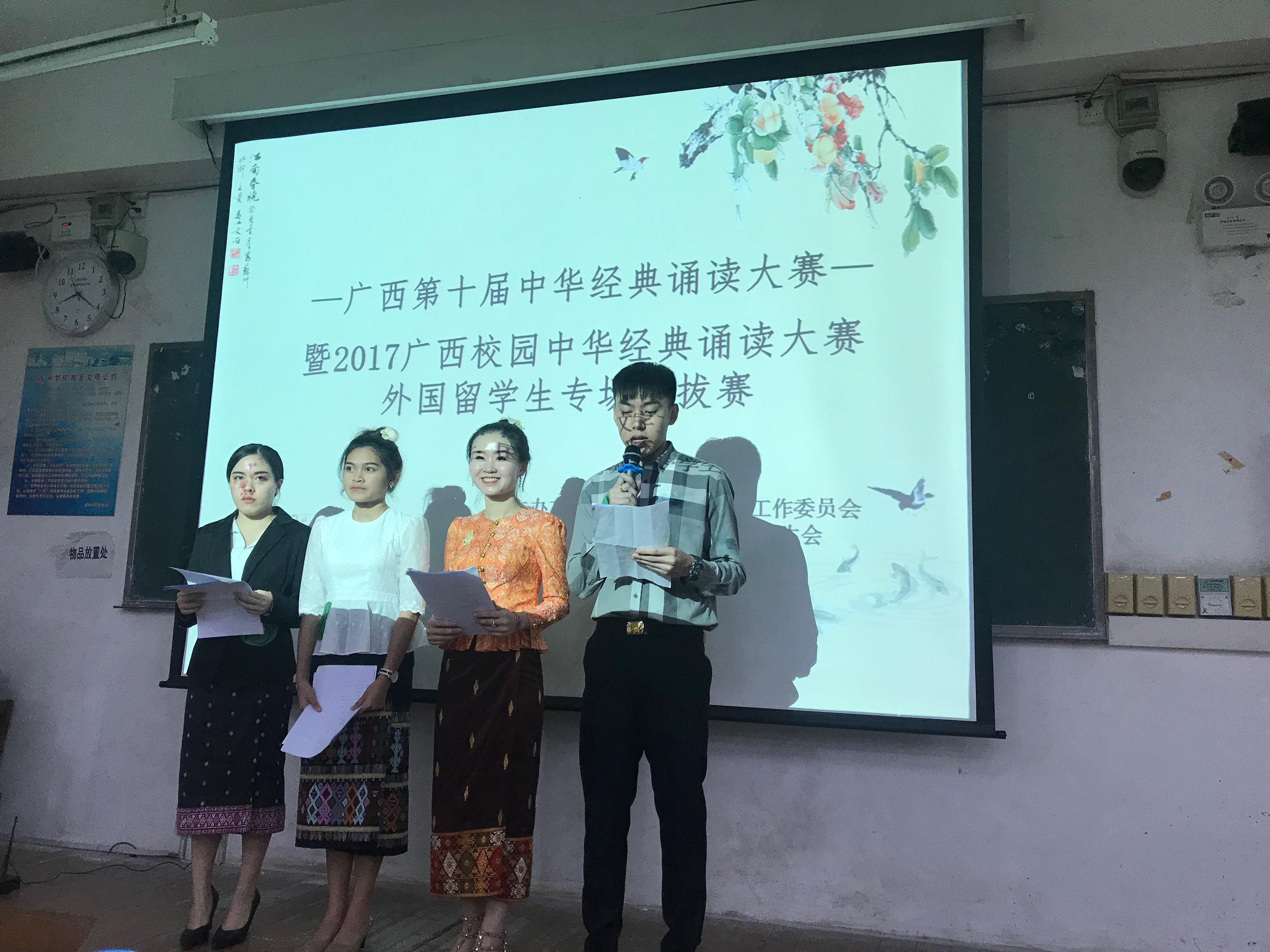 2017年10月31日晚,以“品中华文化,朗中华诗篇,诵中华经典”为主题的广西第十届中华经典诵读大赛――暨2017广西校园中华经典诵读大赛外国留学生专场梧州学院赛区选拔赛在明理楼S603拉开了帷幕。本次朗诵比赛的主办方为梧州学院语言文字工作委员会,承办方为国际交流学院团委.学生会,指导老师为裴英竹老师。莅临比赛现场的特别嘉宾有梧州朗诵委员会专家顾问、梧州电台副台长、一级播音员冯宇红,评委老师有国际交流学院党委副书记、国家级普通话水平测试员冀宁老师,汉语言文学博士何湘君老师和汉语言学专业教师、副教授陈启权老师。本次比赛主持人由李靖松、张思琪共同担任。
