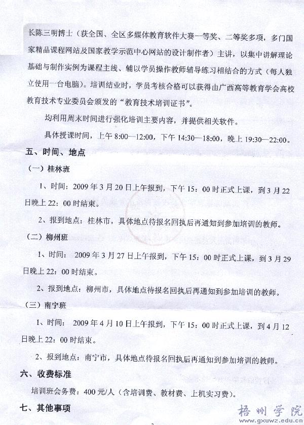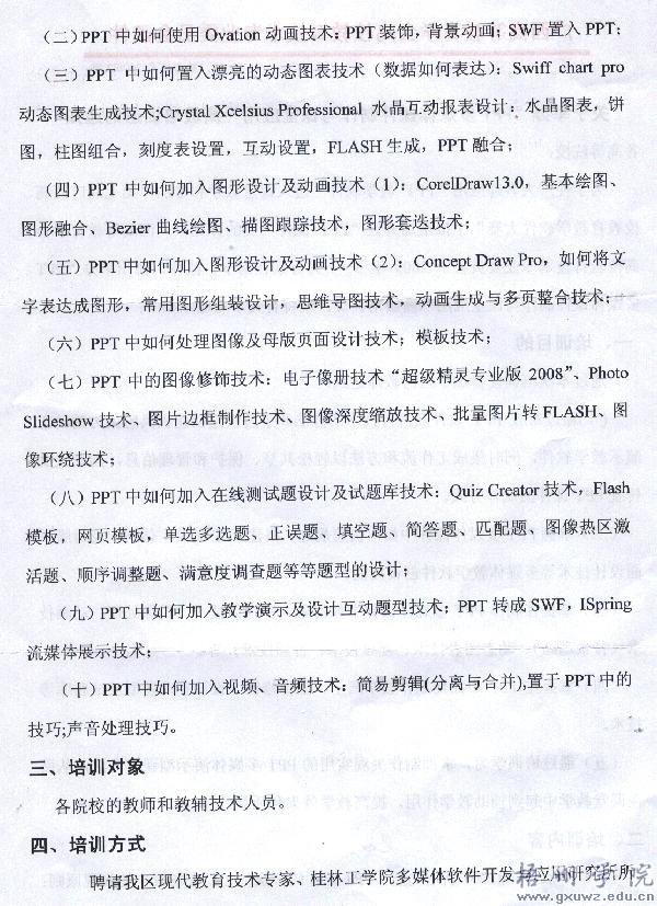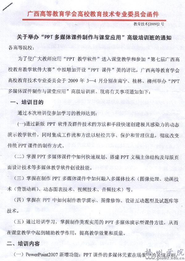 接广西高等教育学会高校教育技术专业委员会《关于举办“PPT多媒体课件制作与课堂应用”高级培训班的通知》(教育技术〔2009〕2号),根据《梧州学院教职工继续教育管理暂行办法》(梧院发〔2008〕82号)中相关条款要求,请各教学单位根据实际情况组织推荐符合条件教师报名参加,各教学单位汇总送培名单后报教务处审核。由教务处会同人事处拟订送培计划报学院领导审批。
