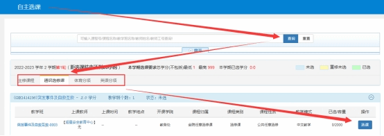 3、学生需登录教务系统进行选课,选课时,选择“选课”中的“自主选课”(如图一),进入自主选课界面后直接点“查询”按钮(如图二),选择相应分项项目课程进行选课。学生根据学习需求和个人爱好进行选课。如果某一门课程选的人数太少,将会取消该门课程的开课。