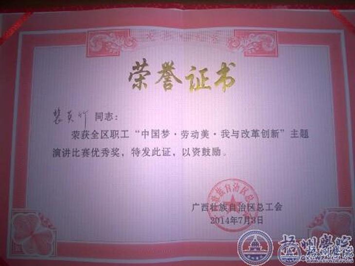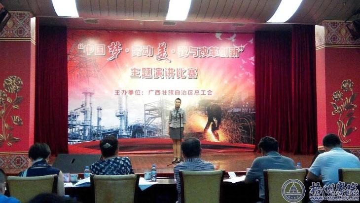7月3日晚上,由自治区总工会举办的“中国梦·劳动美·我与改革创新”主题演讲比赛总决赛在南宁市总工会礼堂举行。来自广西各市以及区直单位选派的参赛选手共有40人,我校教务处职员裴英竹老师代表梧州市参加本次比赛。经过3小时40分的激烈角逐,裴英竹老师以题为《用劳动和创新筑造“中国梦”》发表了精彩演讲,在决赛中以优异成绩获得优秀奖。