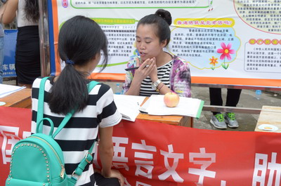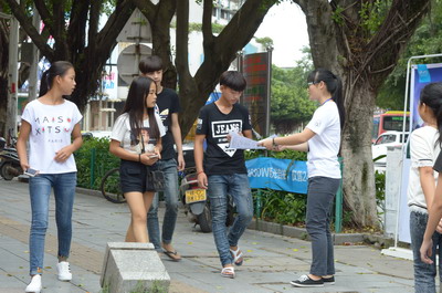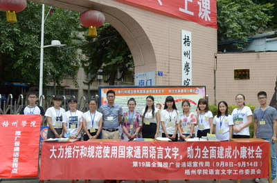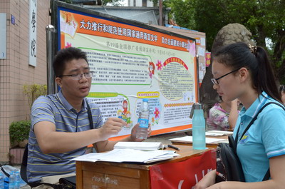 2015年9月14日至20日,是第18届全国普通话推广周。为了积极响应国家的号召做好普通话推广工作,我校于9月19日上午在北校区南门开展了以“依法推广普通话,提升国家软实力”为主题的普通话推广活动。我校国测员冀宁老师、参加过省测员培训的谭新觉老师以及梧州学院语言文字委员会秘书裴英竹老师在现场场进行普通话指导。