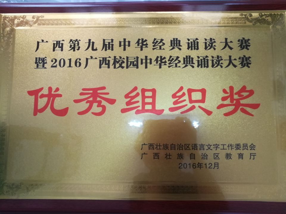 教师集体组选手秦莹、程冕、汤蒸、施定芳、陆璐、裴英竹朗诵的节目《祖国啊,我亲爱的祖国》在广西第九届中华经典诵读视频赛中获集体组优秀奖。