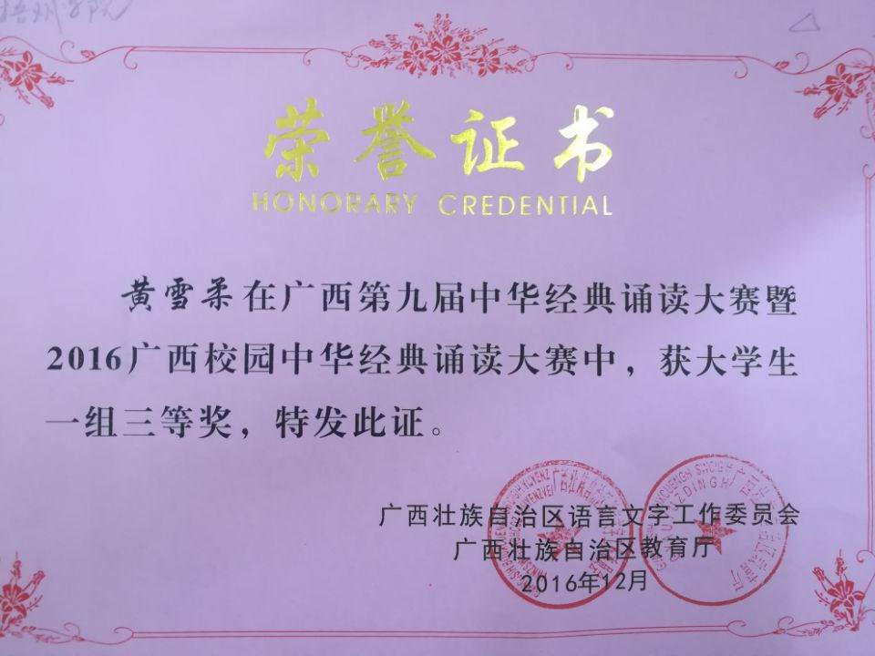 个人组选手黄雪柔(14学前教育1班)在广西第九届中华经典诵读大赛中荣获个人组三等奖。