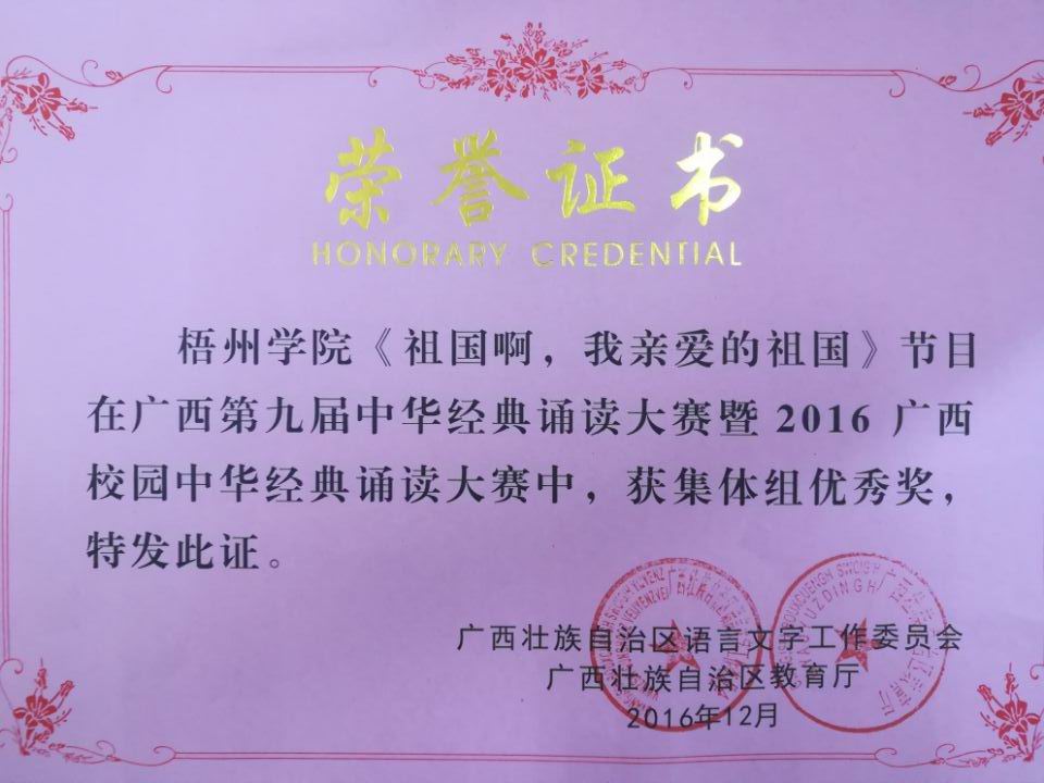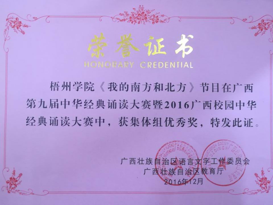 学生集体组选手陶宗腾 (15英语1班)、何云宇(15英语2班)、盘东俊(15音乐学2班)、莫雨菲(15英语1班)、黄雪柔(14学前教育1班)、卢玉婷(14学前教育1班)朗诵的节目《我的南方和北方》在广西第九届中华经典诵读视频赛中获集体组优秀奖。